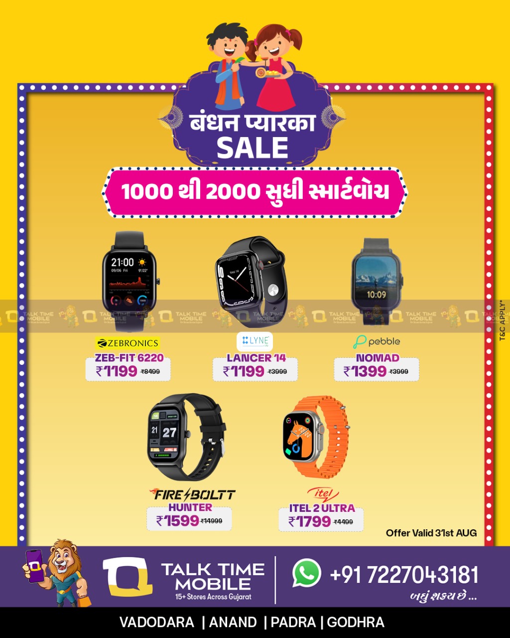 BEST DEAL 💥 अब की बार Discount भरमार!🤩 1000 થી 2000 સુધી ની સ્માર્ટવોચ 😍 Offer Valid 31st August 👉More Information call now +91 7227043181 VADODARA | ANAND | PADRA | GODHRA #Rakshbandhanspecialoffer #bestmobilestore #talktimemobilestore #talktimemobile #baroda #AppleDays #applesale #mobilephone #SpecialDiscountOffer #discounts #beststore #iphon #visitnow #tecno #lancerwatch #smartwatch #watch #ultrawatch #bestprice #tecnophantomseries #phantomseries #buynow #bestoffer #offer